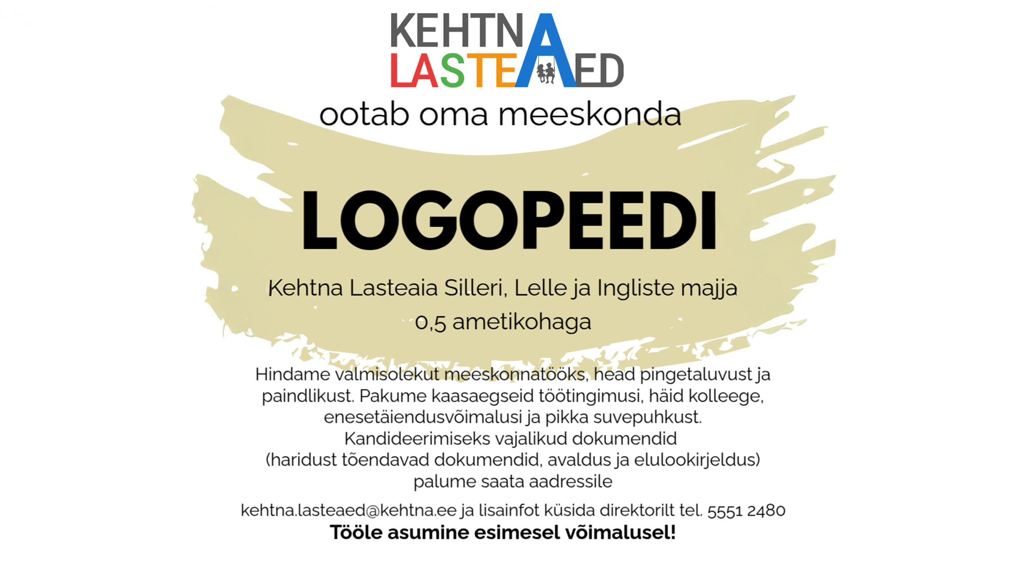 Kehtna Lasteaia Silleri, Lelle ja Ingliste majja ootavad oma meeskond logopeedi – 0,5 ametikohaga.