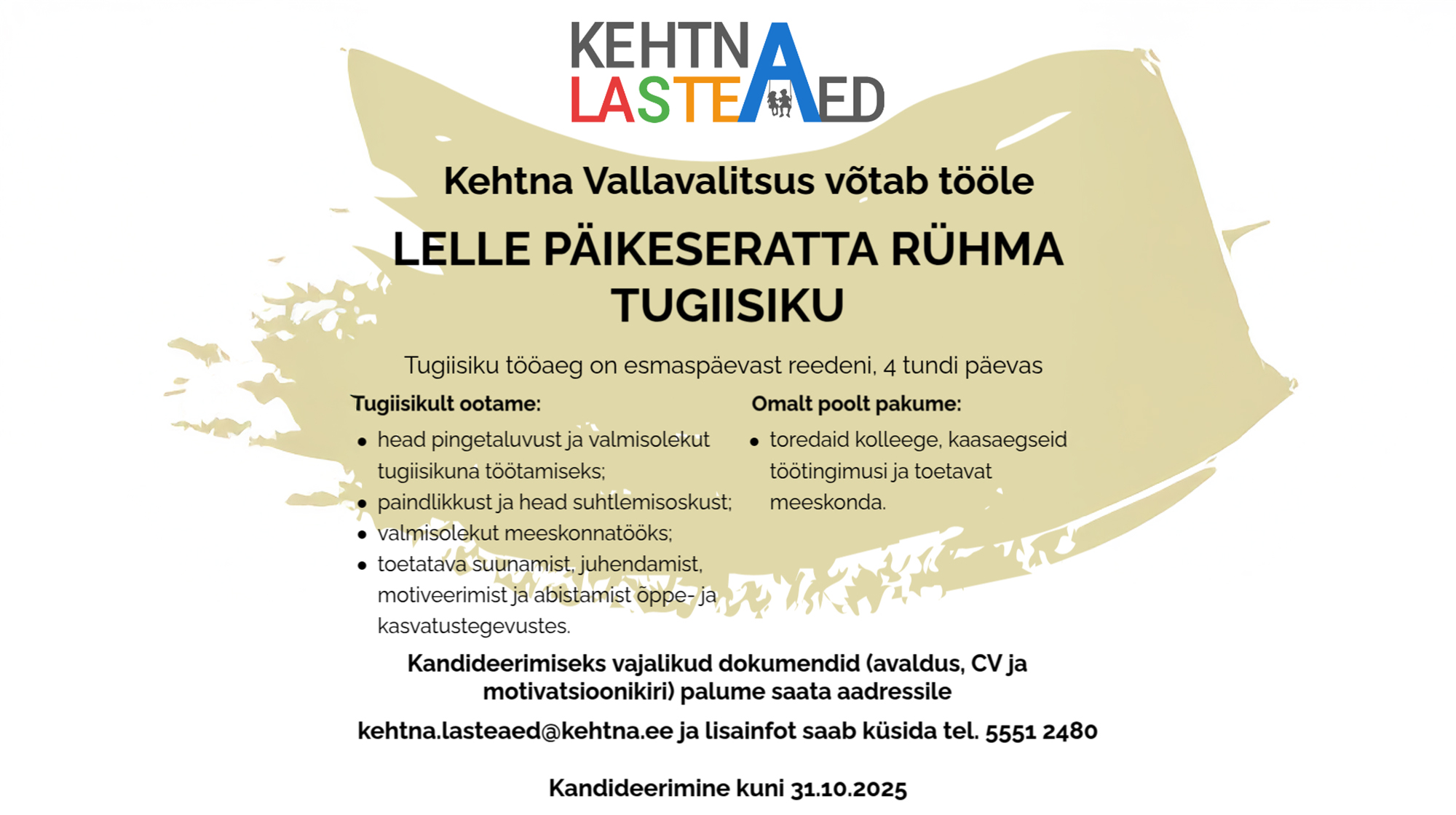 Kandideerimiseks vajalikud dokumendid (avaldus, CV ja motivatsioonikiri) palume saata aadressile kehtna.lasteaed@kehtna.ee ja lisainfot saab küsida telefonil 5551 2480